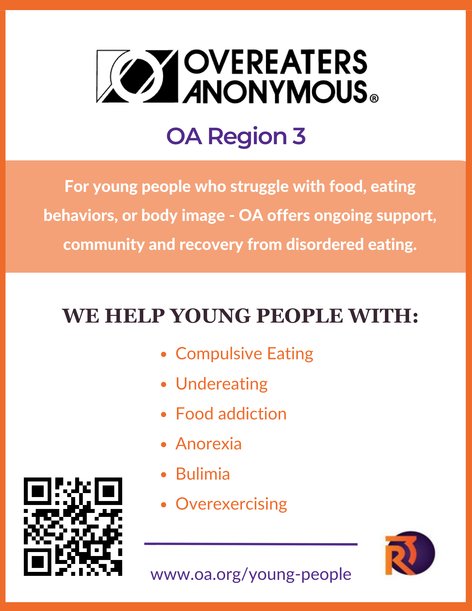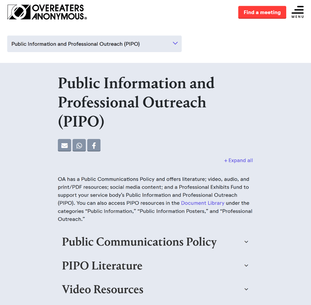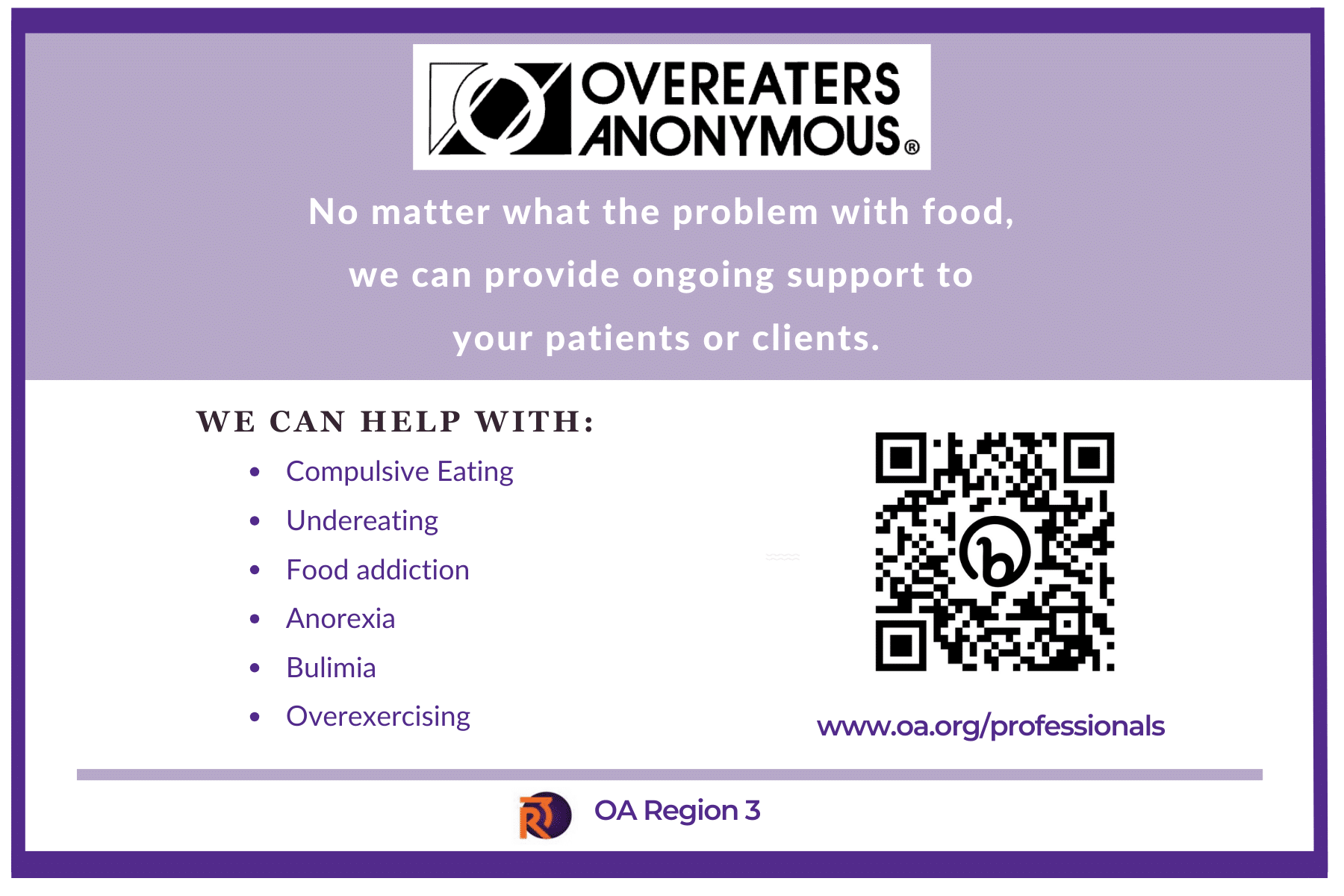These visual pieces make it clear what OA can do for the still suffering compulsive eater. They also have a QR Code that links directly to the OA.org PIPO page with amazing information for the professionals.