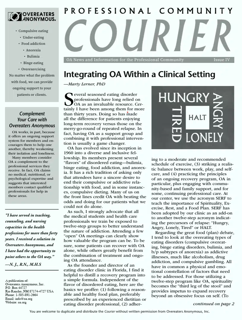 The Region III Professional Outreach and Public Information (PIPO) Committee created a script for a skit to provide OA members with an example of how to talk to healthcare professionals in order to spread the message of recovery to those who are still suffering. The skit is approved as locally produced literature and may be downloaded for use by intergroups, workshops, meeting, or individuals.